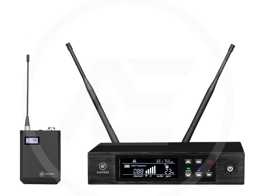 Одноканальная радиосистема с поясным передатчиком. 100 каналов, 640-690 мГц, сканер частот, ИК синхронизация, динамический диапазон 100 дБ, питание 2хАА