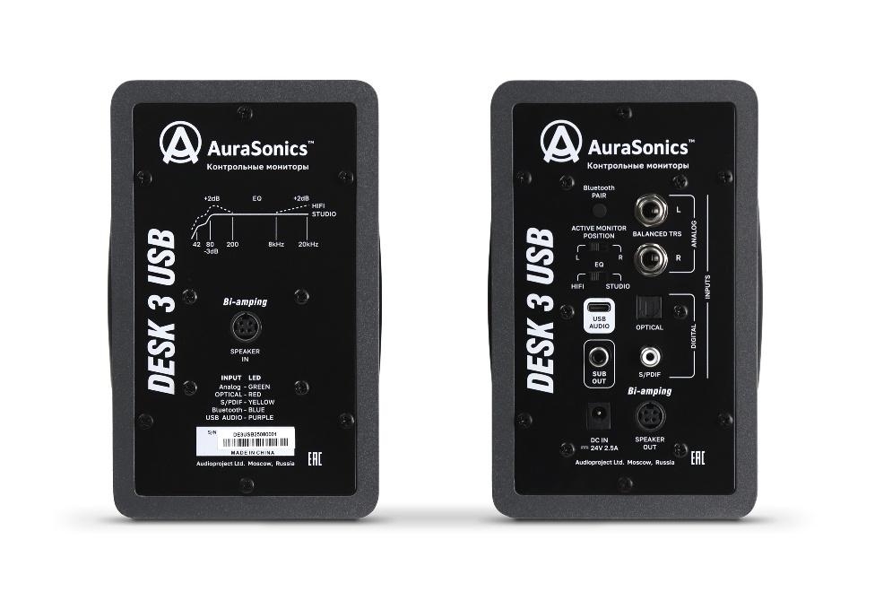 К особенностям модели AuraSonics DESK 3 USB относятся: - 4-канальный усилитель по схеме Bi-Amp - цифровая обработка сигнала 24 бит/48 кГц - цифровой кроссовер для НЧ и ВЧ динамиков - две предустановленные настройки эквалайзера STUDIO и HIFI - встроенный USB-звуковой интерфейс - цифровые входы S/PDIF коаксиальный и оптический TOSLINK - встроенный приёмник Bluetooth V5.3 - цифровая регулировка усиления - автоматический режим выключения при отсутствии звукового сигнала - переключатель положения активного монитора слева или справа - наличие профессиональных балансных входов на разъёмах TRS-Jack - наличие оперативной регулировки громкости на передней панели - наличие выхода на наушники на передней панели - наличие дополнительного входа Aux на передней панели - наличие небалансного выхода RCA на сабвуфер.