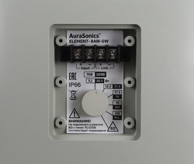 Модель AuraSonics ELEMENT-8AW выпускается в двух цветовых вариантах: чёрном - (BK) и светло-сером (GW), соответствующем цвету RAL9002. Встроенный трансформатор позволяет подключать АС к трансляционным линиям 70/100В.