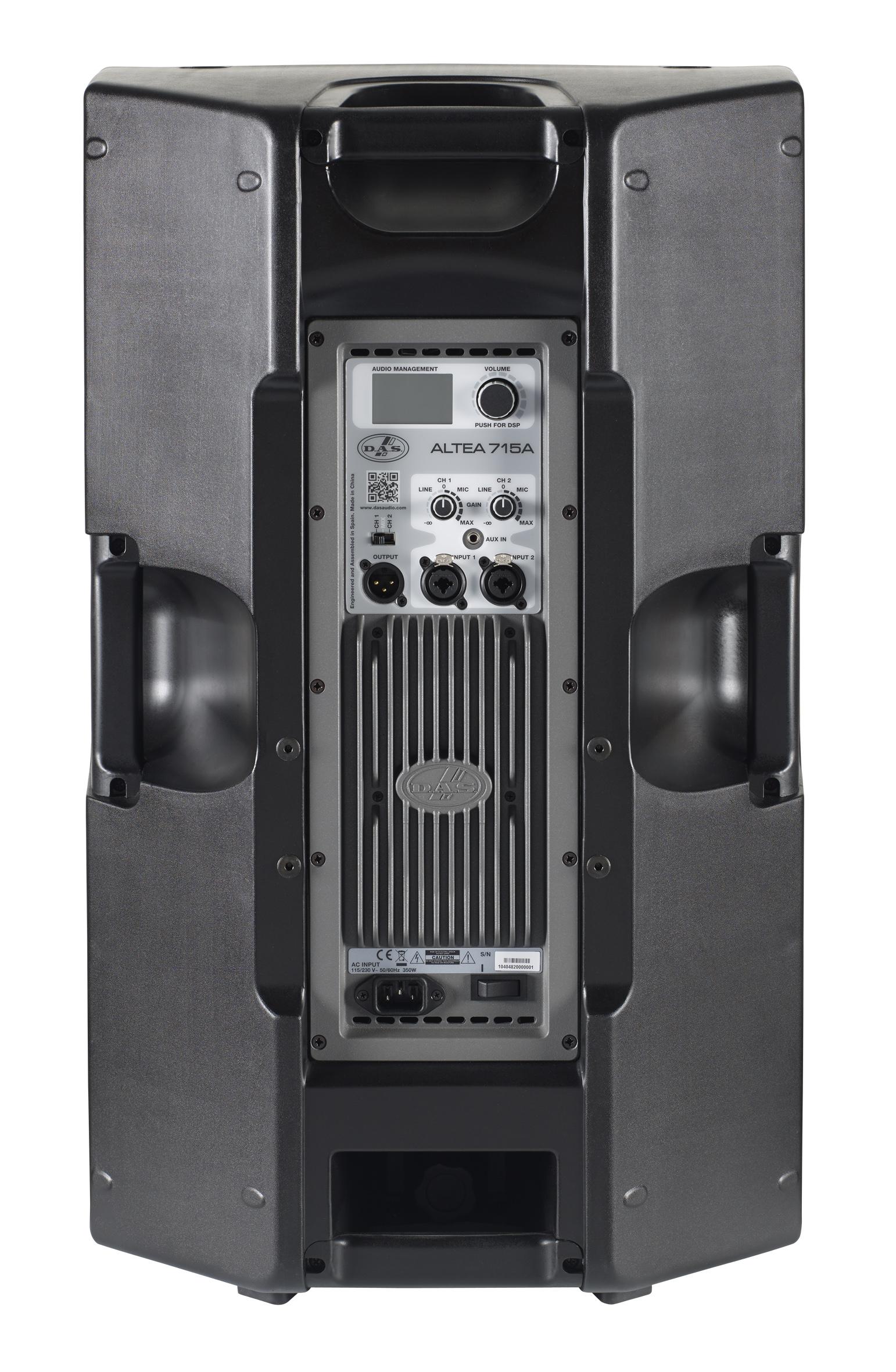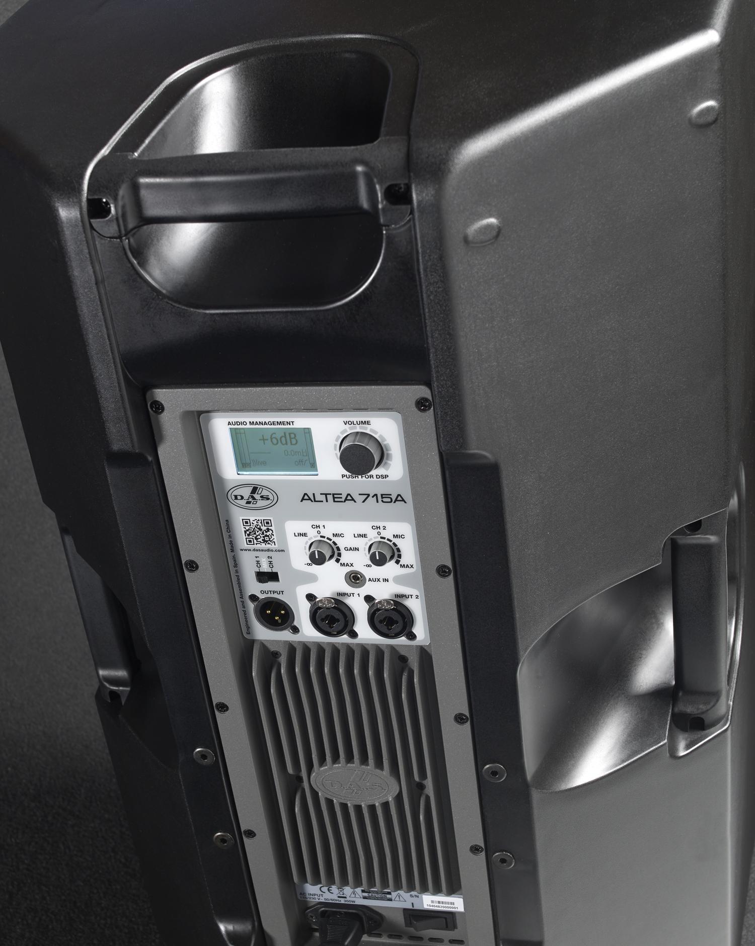 DAS Audio Altea-715A – это высокомощная двухполосная активная акустическая система из линейки DAS Audio Altea. Она оснащена впечатляющим двухканальным усилителем мощностью 1500 Ватт, который обеспечивает расширенный диапазон с минимальными искажениями. В обработке сигнала задействованы фильтры Digital Finite Impulse Response (FIR). Уникальный интерфейс DAScontrol позволяет пользователю создавать собственные пресеты, управлять входящими/исходящими уровнями, настройками эквалайзера, регулировать задержку и т.д. при помощи современного 24-битного ЖК-экрана на задней части кабинета.