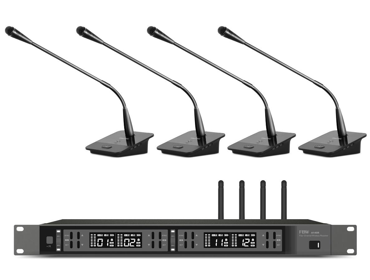 FBW A4-CONFERENCE - четырёхканальная радио конференц система, приёмник A140R + 4 передатчика A100CT, 512-562МГц, FM-модуляция, 2/10/30мВт, 3 уровня Squelch, индикация батареи, 50Гц-15кГц