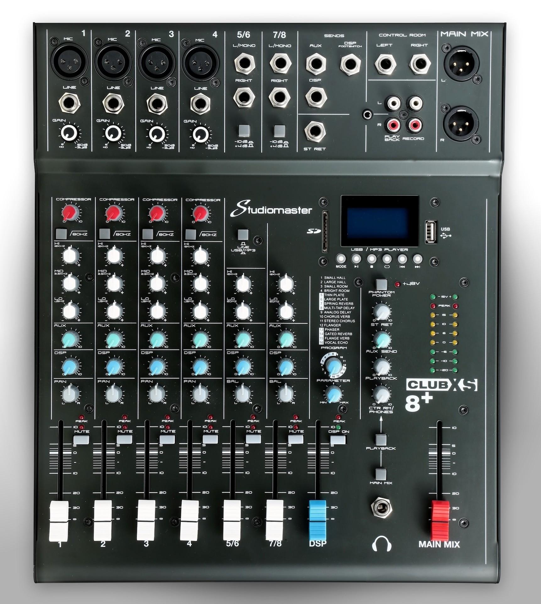 Компактный аналоговый микшер CLUB XS8+ разработан компанией Studiomaster с целью обеспечения достойного качества воспроизведения аудиосигналов от различных источников (каналов) смешивая и обрабатывая их в процессе. Устройство продолжает прекрасно зарекомендовавшую себя на рынке серию CLUB. Микшерный пульт подходит для клубных или фестивальных выступлений DJ, для проведения торжеств и банкетов, при онлайн трансляциях/стримах/записи видеороликов, для репетиций или создания новой музыки в студиях звукозаписи и т.д., и т.п. Рабочий диапазон частот 10 Гц – 20 кГц (+1/-3 дБ).