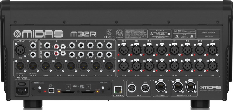 M32R LIVE Digital Mixer имеет в своем распоряжении 40 входных каналов, 16 предусилителей Midas PRO, 25 шин, 17 моторизированных фейдеров, 5-дюймовый TFT-экран, набор регуляторов и кнопок. Благодаря встроенному USB аудиоинтерфейсу 32/32 консоль поддерживает возможность записи. За один сеанс возможно записать до 3-х часов звука в WAV формате используя все 32 канала. Для сохранения записанного материала предусмотрены входы для карт SD и SDHC.
